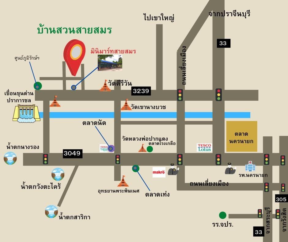 บ้านสวนสายสมรของเรา ห่างจากกรุงเทพฯ เพียง 75 กม. การเดินทางสะดวกสบาย เดินทางตามเส้นทาง นครนายก-น้ำตกวังตะไคร้ บ้านสวนสายสมร ห่างจากสถานที่ท่องเที่ยว เช่น น้ำตกนางรอง น้ำตกวังตะไคร้ เขื่อนขุนด่านปราการชลเพียง 4 กม.